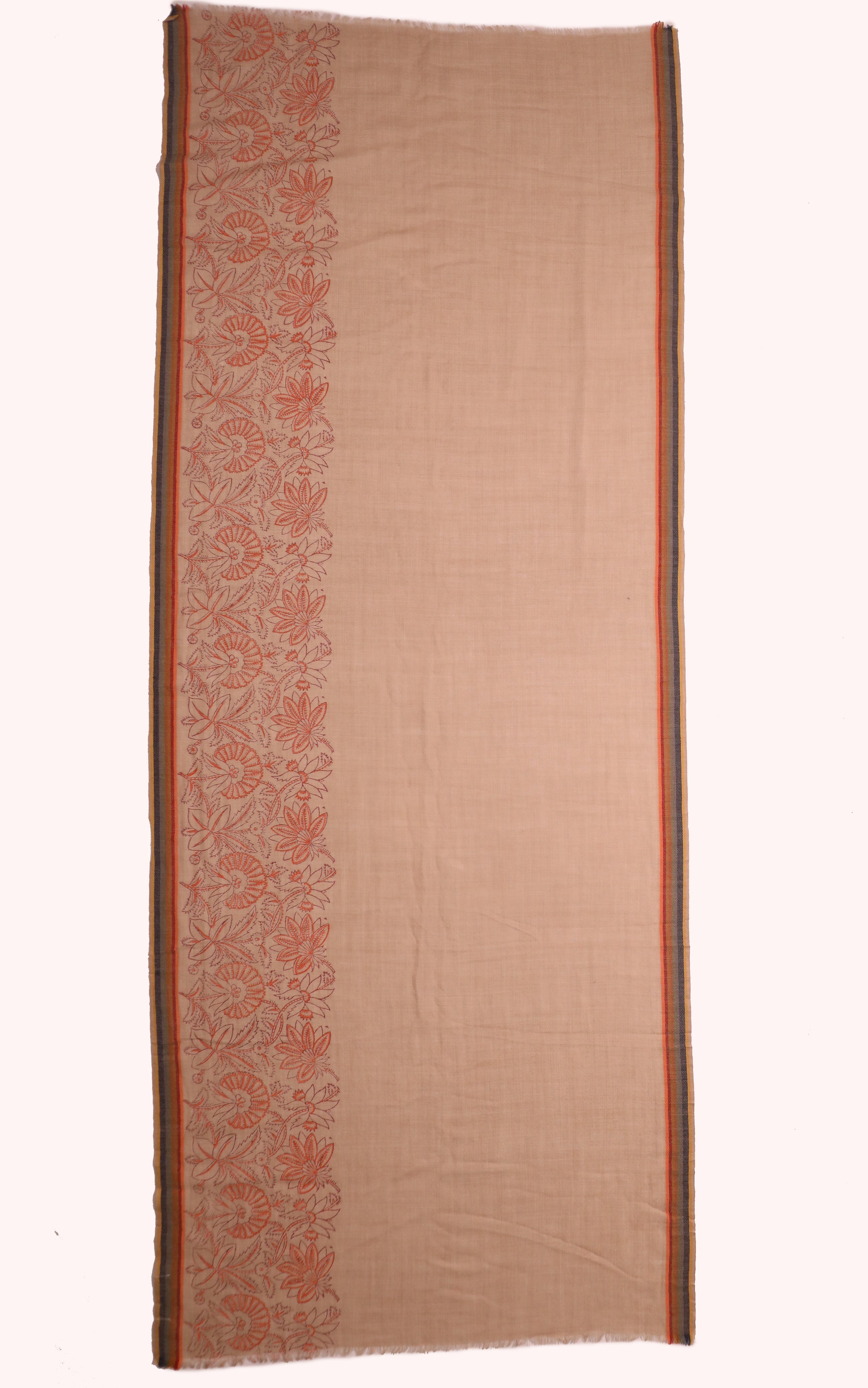 Along one edge runs a beautifully detailed rust-coloured floral border, inspired by hand-sketched botanical art. This asymmetric design adds sophistication without overwhelming the piece. Subtle woven stripes at both ends complete the look, balancing simplicity with artisanal character.