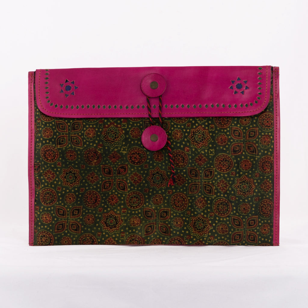 Hand-carved Leather iPad Case with Hand-block Ajrakh Print - Pink Green