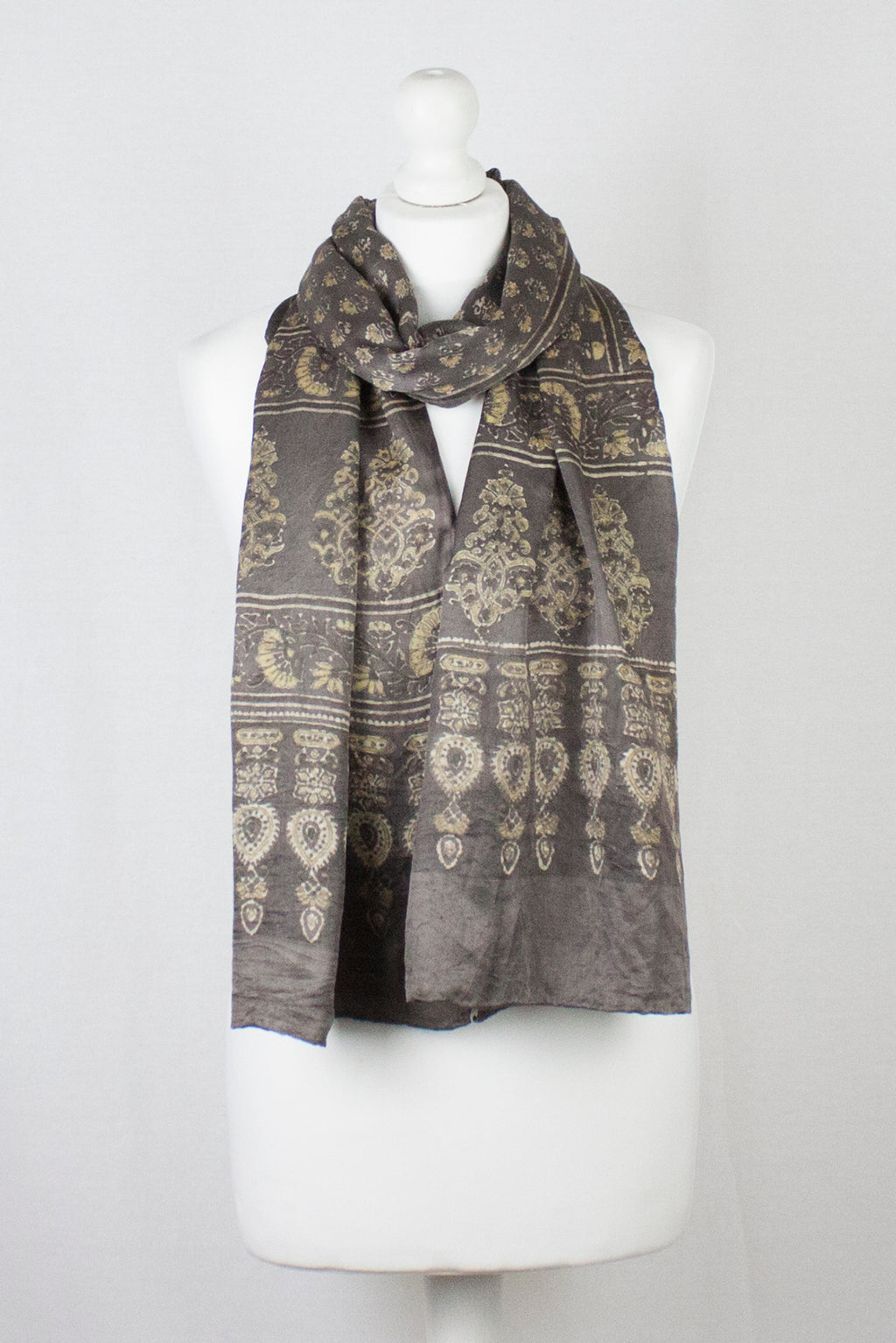 Ditsy Flower Ajrakh Print Silk Scarf - Brown Yellow